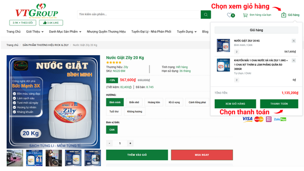 Sau khi bấm chuột vào nút "THÊM VÀO GIỎ HÀNG" quý khách có thể lựa chọn "XEM GIỎ HÀNG" hoặc "THANH TOÁN"